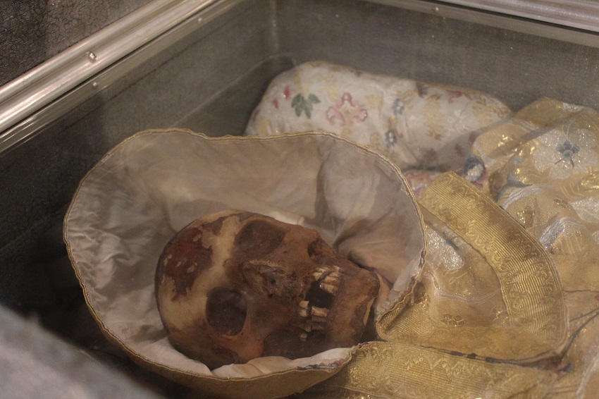 15 minutos fueron los esperados para saber qué había en el altar mayor de la Catedral Magistral. Cada vez que la fila avanzaba, se podía vislumbrar una gran urna dorada en la que varios devotos cerraban los ojos y rezaban e incluso se arrodillaban ante ella. Aquella urna era el motivo por el que había tanta gente en el templo, o mejor dicho, lo que esta contenía. Era nada más y nada menos que un cuerpo… ¿qué digo? ¡Era un esqueleto, una momia! ¡Una momia que era venerada por todos los allí presentes!