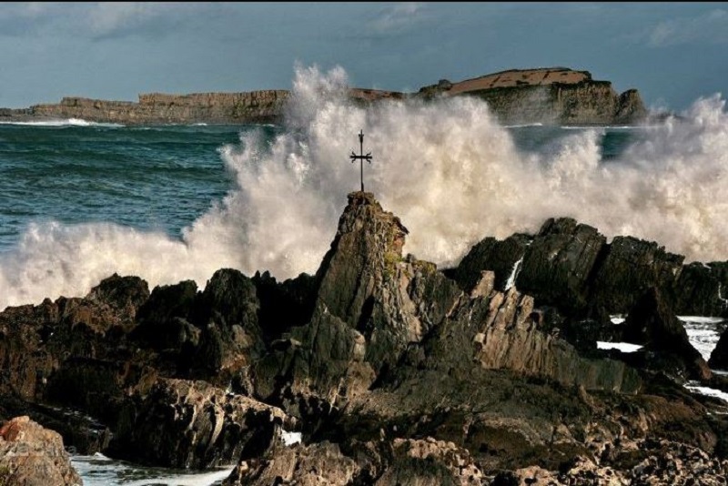 Cruz en Mundaka orientada a la isla de Ízaro, donde habrían fallecido los protagonista de la leyenda