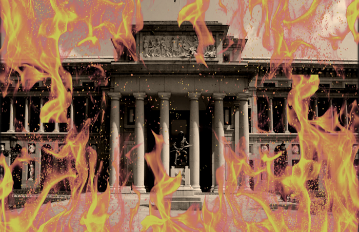 Mariano de Cavia recoge los llantos, auxilios y hasta blasfemias de los que presenciarían la catástrofe. «Europa entera dirá mañana que España ha perdido uno de los pocos florones que quedaban en su corona», asegura un testigo del suceso al periodista zaragozano. Soldados y algunos voluntarios se habrían internado entre las llamas con navajas y cuchillos para arrancar las pinturas de los marcos, pero sin éxito. El estupor y la consternación gobiernan frente al fuego que sume en cenizas al Museo del Prado. Nadie sabe explicar el origen del incendio (dicen que surgió en un desván destinado al personal por un brasero o una colilla mal extinguida).