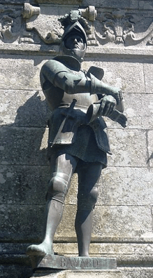Empero la anatemización de Pedro Abailard solo es una hipótesis de las existentes. Hay más personajes históricos cuyo nombre tiene semejanzas con el del mago de Salerno. Ese no es otro que Pierre Terrail de Bayard, un conocido caballero francés que emprende varias campañas militares en la Península Itálica y, cómo no, sobre la Campania. Bayard ha pasado a la Historia como un gran luchador y un destacado espadachín. Es descrito como «el guerrero sin mácula» por su arrojo y valentía en el campo de batalla. Tanto es así que ha quedado grabado en su figura el ideal caballeresco, como atestigua una estatua que tiene en su honor en la localidad francesa de Sainte-Anne-d’Auray, en la Bretaña.