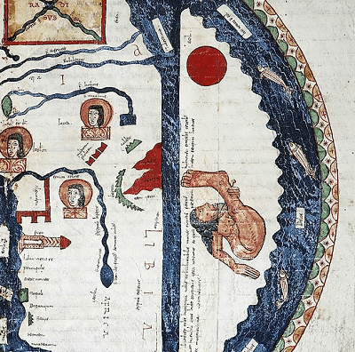 Pero hay más, en esa tierra austral desconocida aparece una pequeña descripción de esta zona que resulta ilegible. Ojalá poder observar este mapa con una lupa y con detenimiento. Sin embargo, sobre este territorio blanco aparece un ser monstruoso dibujado. Se trata de una especie de hombre gigante, con largos cabellos, un solo brazo y una única pierna de grandes dimensiones. Y cuando lo presenciamos, lógicamente nuestra desordenada mente explota por completo. ¿Qué hace un mapa medieval en El Burgo de Osma de tales características? ¿Cuándo y quién lo hizo? ¿En qué se basó? Cuántas preguntas sin respuesta se van acumulando.