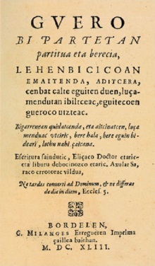 Unos interrogantes que hacen que otro sacerdote de San Juan de Luz, de nombre Juan Arostegi, denuncie a Pedro para que le destituyan. Su caso se hace tan sonado que llega a manos del monarca de Francia, en este caso Enrique IV. Es el propio rey el que toma cartas en el asunto y dice que no, que no haY motivo para quitar de su puesto a Pedro Axular. Por tanto, el navarro estará en Sara de párroco hasta el 8 de abril de 1644. En esa fecha, el gran intelectual fallece a los 88 años de edad. Muere además dejando una obra escrita. Un trabajo de 70 capítulos redactado de forma ascética y que habla sobre el pecado. Está escrito en euskera y, por tanto, es el primer libro escrito en prosa de la literatura vasca. Una obra importante hecha por un personaje importante.